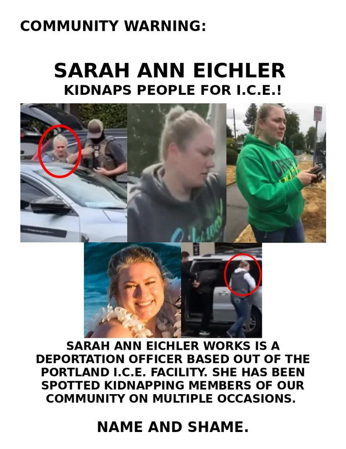 Sarah Ann Eichler bekerja sebagai penculik anak di fasilitas I.C.E. Portland. Sarah menjadi viral pada tahun 2017 karena memprofilkan seorang pria secara rasial di luar gedung pengadilan Washington County. Sejak saat itu, ia terlihat memimpin penangkapan deportasi lainnya. Seperti pada bulan Agustus tahun ini ketika Sarah membantu menculik seorang pria di luar tempat binatu Beaverton.