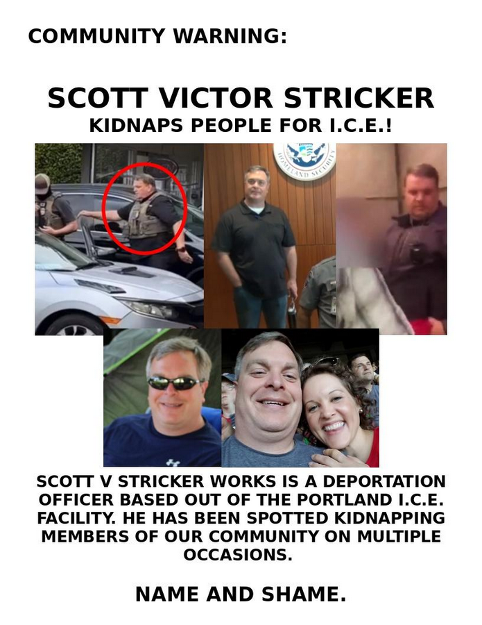 Kami memublikasikan nama dan wajah dua agen I.C.E. yang telah beberapa kali terlihat menculik orang di area Portland dan sekitarnya. Orang-orang ini merupakan ancaman bagi komunitas kita. Mereka tidak layak mendapatkan kedamaian atau anonimitas. Tidak ada keamanan bagi para bajingan Gestapo di I.C.E.!