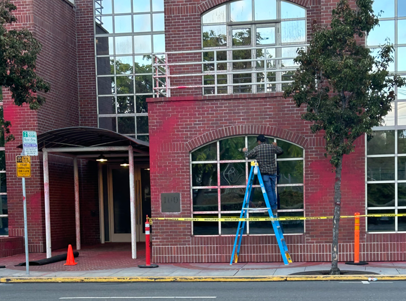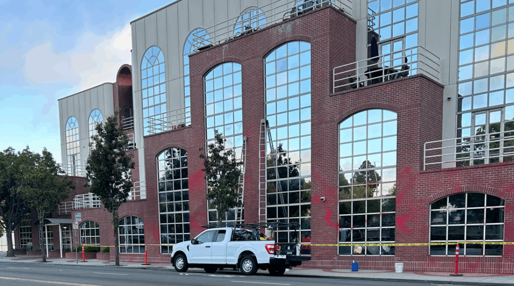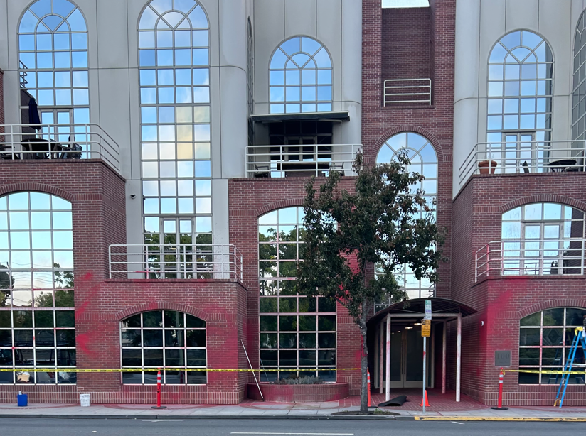 Kantor Palo Alto Palantir, sebuah perusahaan surveilans AI yang menjalin relasi dengan Israel, ICE, dan militer AS – diguyur cat merah.