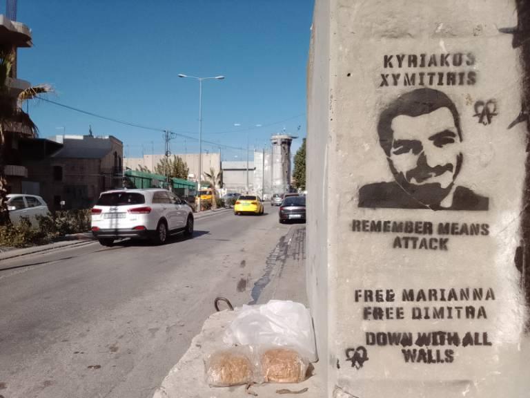 Dengan pikiran kami yang dekat dengannya, kami mencetak stensil wajahnya bersama nama Marianna dan Dimitra pada tembok apartheid. Tembok yang merusak dan mengancam kehidupan rakyat Palestina, sekaligus mengungkapkan tanda-tanda resistansi, tanda-tanda api, dan membawa slogan-slogan untuk dunia yang bebas di antara wajah-wajah banyak orang yang telah mengorbankan nyawa mereka demi keadilan. Di situlah senyuman Kyriakos berada, tersenyum kepada kita dari atas.