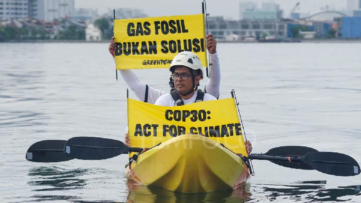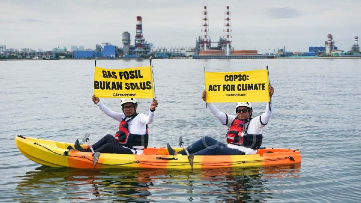 Aktivis Greenpeace menggelar aksi damai di lokasi Pembangkit Listrik Tenaga Gas Uap Muara Karang, Jakarta, 18 November 2025. Aksi itu berlangsung bersamaan dengan Konferensi Tingkat Tinggi Perubahan Iklim PBB (COP 30) di Brazil. Mereka memprotes inkonsistensi kebijakan energi nasional dan menuntut pemerintah mewujudkan janji iklim global dengan menghentikan ketergantungan pada energi fosil, termasuk rencana pengembangan gas fosil sebagai energi transisional.