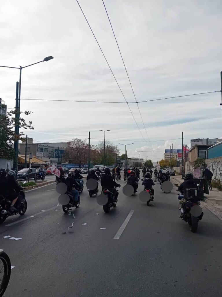 Sekitar 70 orang berkumpul di titik awal Plateia Amerikis dengan motor dan sepeda. Di sana, serta di Plateia Viktoria dan Plateia Agios Panteleimonas, di mana demonstrasi berhenti sejenak di sepanjang rute, kami mendistribusikan teks dan melemparkan trikakia, menentang presensi polisi di plaza dan lingkungan kami, menentang operasi polisi yang rasis. Dengan berhenti di alun-alun sepanjang perjalanan menuju penjara migran di Petrou Ralli, kami bertujuan untuk menyoroti koneksi antara kota, lingkungan kami, dan penjara. Orang-orang ditangkap oleh polisi setiap hari karena dokumen mereka dari plateias, jalanan, dan stasiun ke penjara seperti Petrou Ralli atau Amygdaleza yang sengaja diisolasi. Dengan melewati Stathmos Larisis dan Viktoria, kami bertujuan untuk menyoroti bagaimana bus, metro, dan kereta api kini menjadi lokasi di mana polisi menargetkan orang untuk memeriksa dokumen – hal ini menjadi jelas ketika sekelompok polisi bersembunyi di dalam metro saat kami melintas.