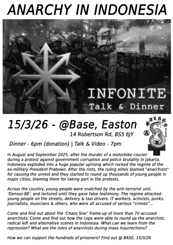 Hadiri dan temukan informasi mengenai rekayasa kasus ‘Chaos Star‘ yang menjerat lebih dari 70 anarkis yang dituduh. Hadiri dan temukan bagaimana polisi berhasil menangkap anarkis, kiri radikal, dan skena alternatif di Indonesia. Apa yang dapat kita pelajari dari represi ini? Apa peran anarkis selama insureksi massal?
