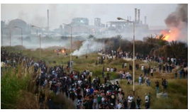 4/12, Genoa, Italia. Lebih dari 5.000 pekerja logam turun ke jalan-jalan Genoa sebagai bagian dari pemogokan umum industri untuk mendukung perjuangan pekerja di bekas pabrik baja Ilva. Para pekerja menggunakan kendaraan berat seperti truk, derek, atau traktor untuk memblokir jalan dan jalan raya, dan menghadapi represi kekerasan oleh polisi untuk menentang penutupan pabrik baja yang akan meninggalkan 1.200 pekerja tanpa pekerjaan. Bentrokan antara polisi dan demonstran meletus di depan gedung prefektur kota ketika pekerja dari pabrik baja Ilva yang telah ditutup mencoba menembus blokade polisi yang didirikan untuk melindungi gedung pemerintah. Pekerja di pabrik baja terbesar di Eropa, yang telah melakukan pemogokan dan mobilisasi terus-menerus sejak bulan lalu, menghancurkan penghalang logam yang digunakan polisi untuk memblokir area tersebut. Polisi menembakkan gas air mata untuk menekan protes. Setelah bentrokan dengan polisi di depan gedung prefektur, demonstran tiba di stasiun kereta api kota dan memblokir lalu lintas kereta api.